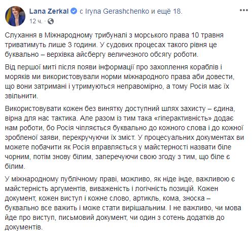 До этого Зеркаль заявляла, что Россия отказалась от участия в слушаниях Международного трибунала по украинским морякам.