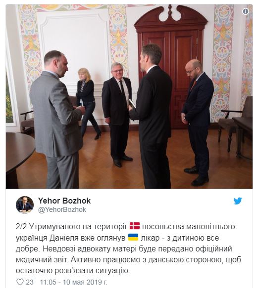 Удерживаемого в посольстве Дании в Киеве двухлетнего мальчика Даниэля осмотрел украинский врач. Об этом сообщил заместитель главы МИД Егор Божок на своей странице в Twitter. Он добавил, что МИД работает с датской стороной для решения сложившейся проблемы.