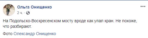 В Киеве на Подольско-Воскресенском мосту (т.н. мост на Троещину), который хотели еще два года назад предложить достроить китайцам, рухнул подъемный кран. Об этом сообщила жительница столицы Ольга Онищенко на своей странице в Facebook в пятницу, 10 мая.