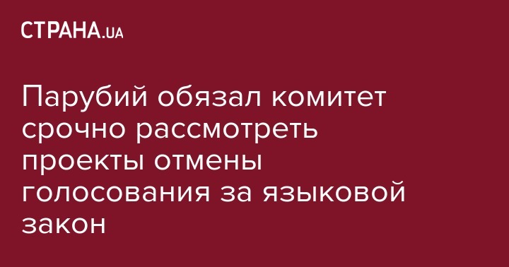 Глава Верховной Рады Андрей Парубий поручил Регламентному комитету неотложно рассмотреть проекты постановлений об отмене голосования за закон "Об обеспечении функционирования украинского языка как государственного", которые блокируют подписание закона, сообщает "Интерфакс-Украина".