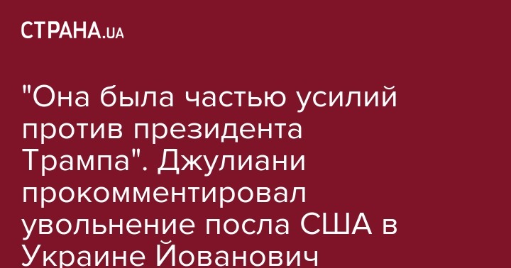 Адвокат Дональда Трампа Рудольфа Джулиани в интервью журналисту Дмитрию Анопченко заявил, что поддерживает увольнение посла США в Украине Мари Йованович, так как она предоставляла недостоверную информацию украинским властям и была на стороне демократов.