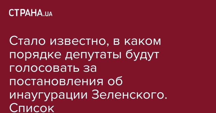Сегодня после рассмотрения Верховной Радой появился список постановлений о дате инаугурации избранного президента Украины Владимира Зеленского в порядке их поступления в парламент. По предварительным данным, именно в таком порядке депутаты будут голосовать за них завтра.