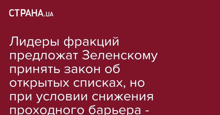Завтра, 21 мая, на консультациях по досрочному прекращению полномочий Верховной Рады между президентом Украины Владимиром Зеленским и фракционными лидерами парламента, последние предложат изменить закон о выборах со смешанной системы на открытые списки, но при условии снижения проходного барьера. Об этом сообщили "Стране" сразу два представителя разных фракций, которые будут завтра на встрече с Зеленским.