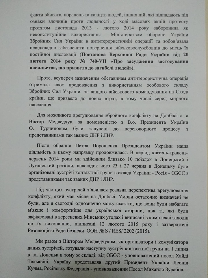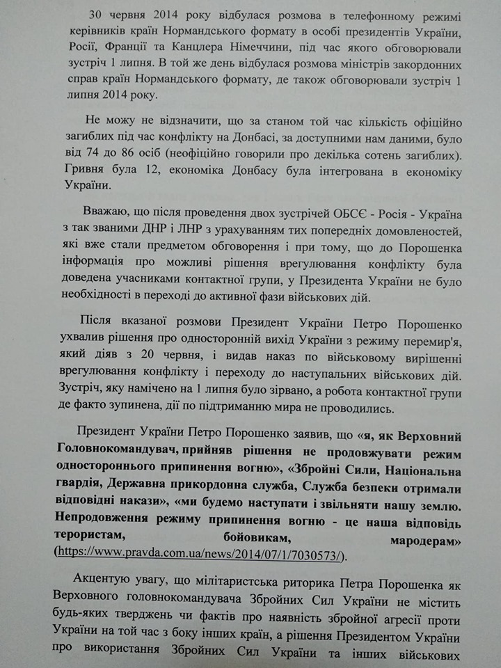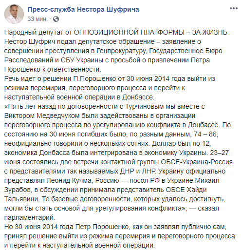 Речь идет о решении Петра Порошенко от 30 июня 2014 года выйти из режима перемирия, переговорного процесса и перейти к наступательной военной операции в Донбассе. "Пять лет назад по договоренности с Турчиновым мы вместе с Виктором Медведчуком были задействованы в организации переговорного процесса по урегулированию конфликта в Донбассе. По состоянию на 30 июня погибших было, по разным данным, 74-86, неофициально говорили о нескольких сотнях. Доллар был по 12, экономика Донбасса была интегрирована в экономику Украины. 23–27 июня состоялись две встречи контактной группы ОБСЕ-Украина-Россия с представителями так называемых ДНР и ЛНР. Украину официально представлял Леонид Кучма, Россию - посол РФ в Украине Михаил Зурабов, в обсуждении принимала представитель ОБСЕ Хайди Тальявини. Те базовые договоренности, которых удалось достигнуть, могли бы стать основой для урегулирования конфликта", - написал парламентарий.