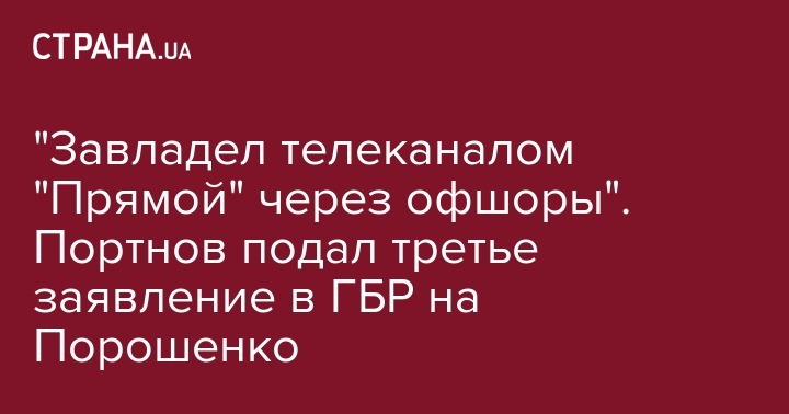 "Друзья, зарегистрировал в Государственном бюро расследований третье заявление об отмывании средств, легализации незаконных доходов и неуплате налогов бывшим Президентом Порошенко, который в составе организованной преступной группы завладел телеканалом "Прямой", оформив его на оффшорную компанию, фиктивно принадлежавшую бывшему члену Партии Регионов Макеенко", - заявил Портнов.