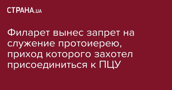 Во вторник, 28 мая, почетный патриарх Филарет подписал указ о запрете в служении протоиерею Александру Трофимлюку, который является настоятелем прихода Покровского храма Соломенского района Киева, перешедшего недавно в ПЦУ. Об этом на своей странице в Facebook сообщает религиозная организация "Десять Тез".