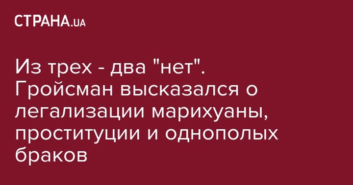 "Из трех два "нет", - сказал он на Форуме для активной молодежи "Державотворець в дії" в четверг в Киеве, отвечая на вопрос о его отношении к легализации марихуаны, проституции и однополых браков, пишет Интерфакс-Украина. В то же время, Гройсман не захотел отвечать легализацию чего именно не поддерживает. Впрочем, скорее всего, "да" Гройсмана касается медицинской марихуаны, старт легализации которой дали в Раде в этом месяце.