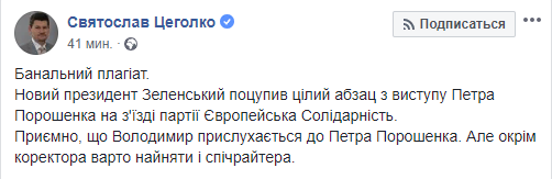"Банальный плагиат. Новый президент Зеленский украл целый абзац из выступления Петра Порошенко на съезде партии Европейская Солидарность. Приятно, что Владимир прислушивается к Петру Порошенко. Но кроме корректора стоит нанять и спичрайтера", - написал Цеголко.