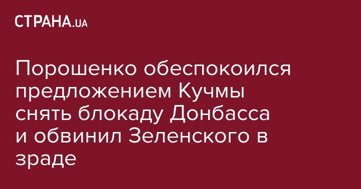 Экс-президент Украины Петр Порошенко заявил об обеспокоенности возможным снятием экономической блокады с ОРДЛО по предложению Леонида Кучмы и Владимира Зеленского. Об этом он сообщил на своей странице в Facebook.