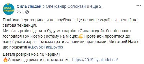 Мы пять лет открыто строим партию "Сила людей" без теневого хозяина и меняем систему на местах. Однако чтобы пробиться к вашему вниманию сейчас – должны играть по новым правилам. Мы готовы! Нам есть что показать! #ШоубізТакШоубіз", - сказано в сообщении.