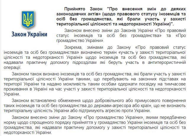 Ранее действующий состав парламента принял закон "О внесении изменений в некоторые законодательные акты (относительно правового статуса иностранцев и лиц без гражданства, которые принимали участие в защите территориальной целостности и неприкосновенности Украины)".