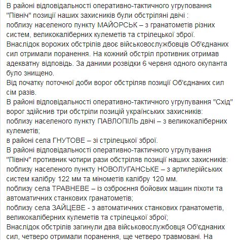 Ночью 7 июня противник атаковал подразделения ООС в районе Новолуганского, в результате чего погибли двое военнослужащих и еще восемь получили ранения. Об этом сообщает пресс-центр ООС в Facebook.