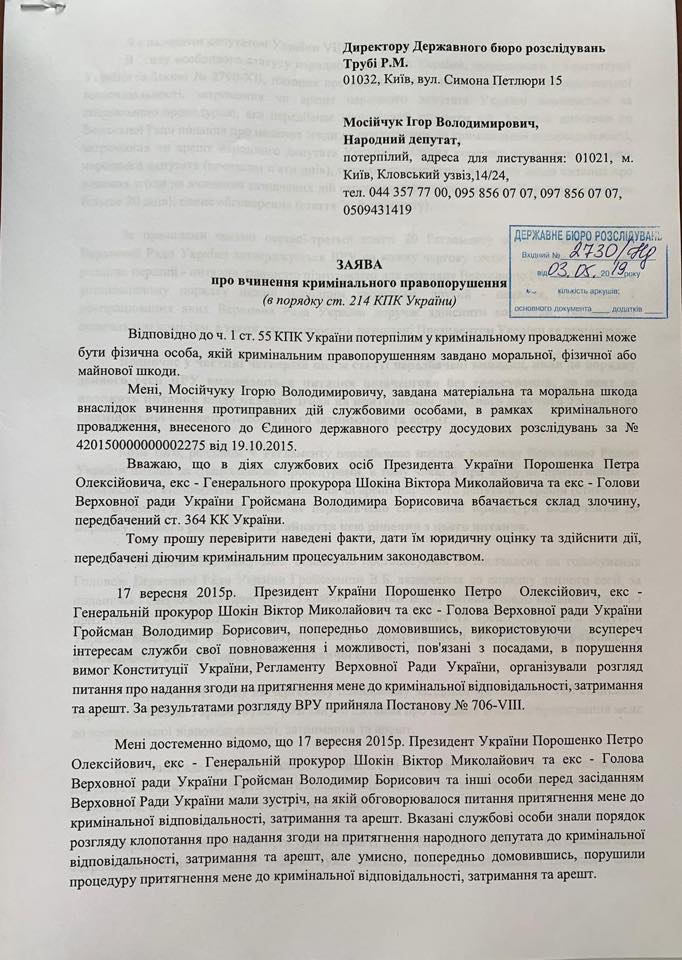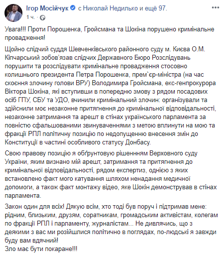 "Мне достоверно известно, что 17 сентября 2015 президент Украины Петр Порошенко, экс-генпрокурор Виктор Шокин и экс-глава Верховной Рады Владимир Гройсман и другие лица перед заседанием Верховной Рады имели встручу, на которой обговаривался вопрос привлечения меня к уголовной ответственности, задержания и ареста. Указанные служебные лица знали порядок рассмотрения ходатайства про предоставление согласия на привлечения народного депутата к уголовной ответственности, но умышленно, предварительно договорившись, нарушили процедуру привлечения меня к уголовной ответственности", - сказано в заявлении Мосийчука.