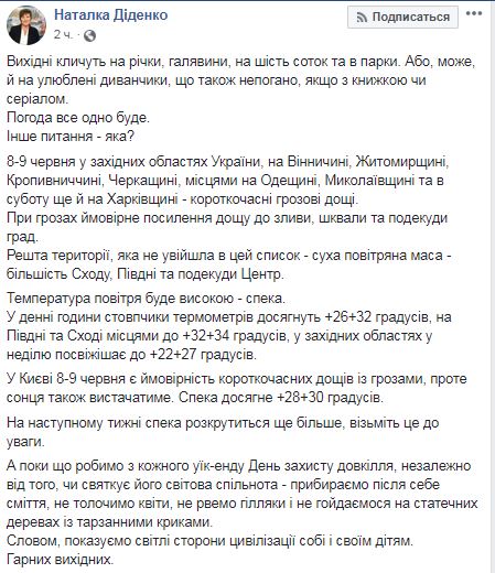 В выходные дни, 8-9 июня, на территории Украины ожидается жаркая, местами дождливая погода. Об этом сообщила синоптик Наталья Диденко на странице в Facebook.