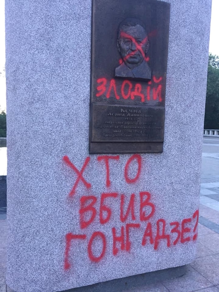 В Днепре неизвестные осквернили монумент, который состоит из стел с барельефами прославленных жителей Днепропетровщины. В частности досталось изображению экс-президента Леонида Кучмы, которое неизвестные перечеркнули красной краской и сделали две надписи: "Преступник" и "Кто убил Гонгадзе?".