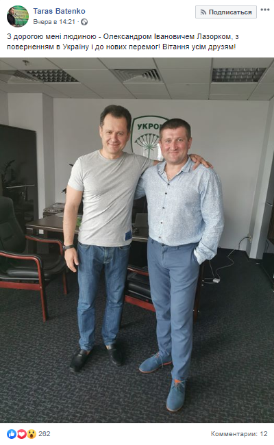 Экс-глава Укртранснафты Александр Лазорко вернулся в Украину. Об этом на своей странице в соцсети сообщил глава партии "Укроп" Тарас Батенко.