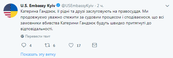 "Екатерина Гандзюк, ее родные и друзья заслуживают правосудия. Мы продолжаем внимательно следить за судебным процессом и надеемся, что все заказчики убийства Екатерины Гандзюк будут быстро привлечены к ответственности", - сказано в сообщении.