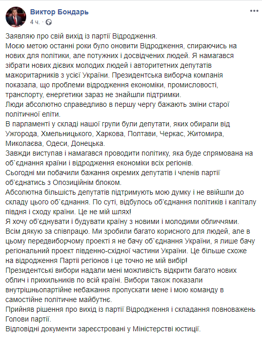 Лидер партии "Видродження" Виктор Бондарь сообщил, что написал заявление о выходе из политической силы и слагает полномочия ее председателя. Об этом он написал на своей странице в Facebook.