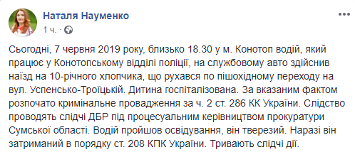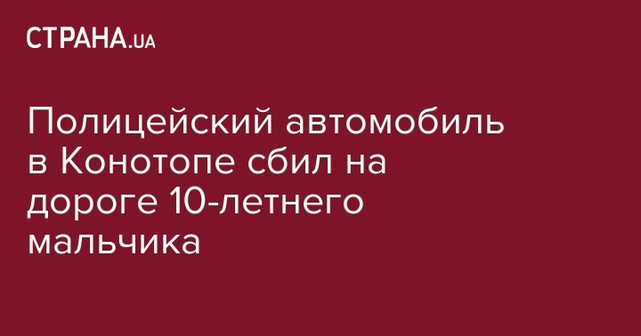 "Происшествие произошло в Конотопе, по улице Успенской-Троицкая, около 18:30. Автомобиль местного отделения полиции, двигаясь по проезжей части, совершил наезд на 10-летнего мальчика, который в это время перебегал дорогу вне пешеходного перехода", – сказано в сообщении на странице ведомства в Фейсбук в пятницу вечером.