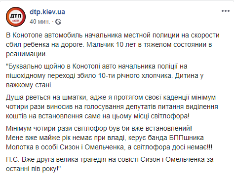 "Буквально только что в Конотопе авто начальника полиции на пешеходном переходе сбило 10-летнего мальчика. Ребенок в тяжелом состоянии", – говорится в сообщении.