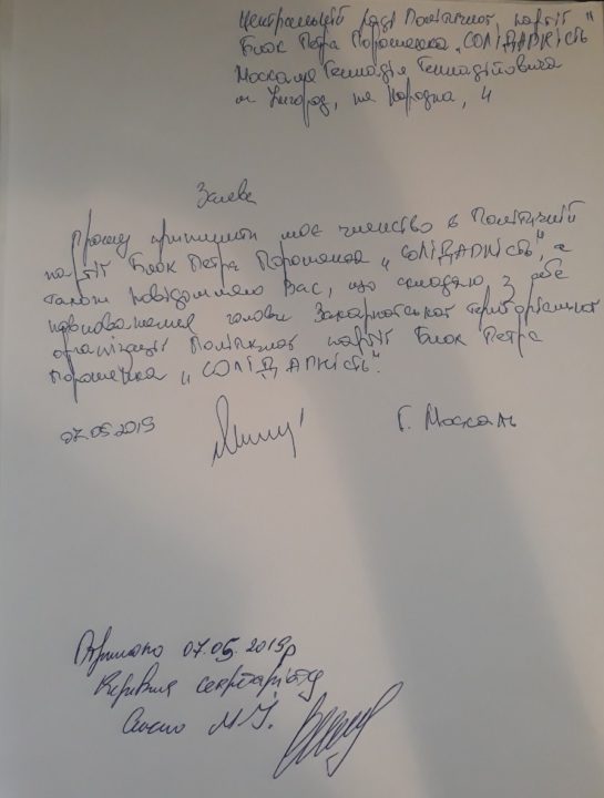 Заявление было подано в Центральный совет партии Блок Петра Порошенко "Солидарность" в пятницу, 8 июня.