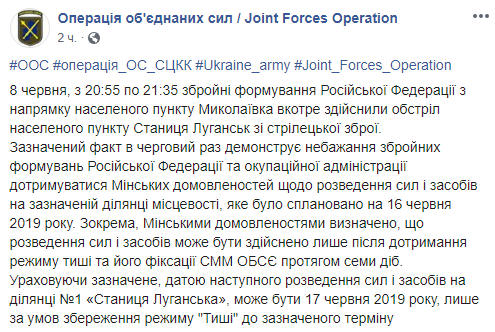 "Указанный факт в очередной раз демонстрирует нежелание вооруженных формирований Российской Федерации и оккупационной администрации придерживаться минских договоренностей по разведению сил и средств на указанном участке местности, которое было спланировано на 16 июня", - говорится в сообщении.
