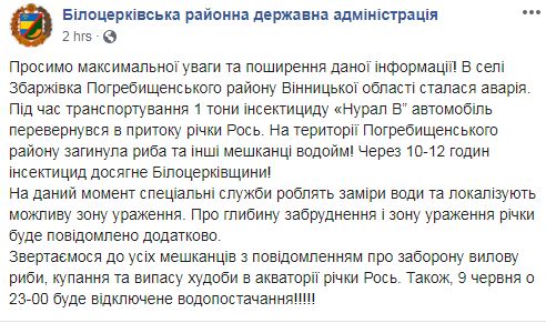 Также в сообщении говорится, что на данный момент на территории Погребищенского района, где случилась авария, погибла рыба и другие обитатели водоемов. В связи со случившемся в акватории реки Рось запрещено ловить рыбу, купаться и пасти скот.