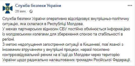 "С целью недопущения обострения ситуации в Кишиневе, связанной с иностранным вмешательством во внутренние процессы, в настоящее время усилен контрразведывательный режим на въезде в Молдову через территорию Украины относительно радикально настроенных граждан Российской Федерации", - сообщает пресс-центр СБ Украины в понедельник утром.
