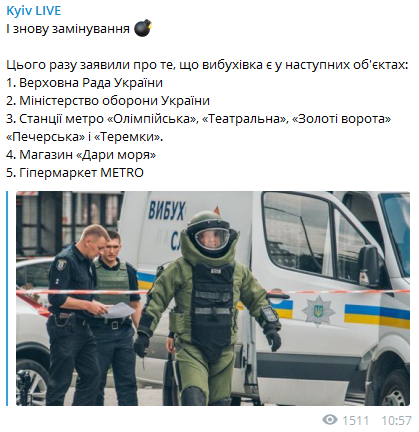 В частности, поступило сообщение о взрывчатки станций метро "Олимпийская", "Театральная", "Золотые ворота", "Печерская" и "Теремки". Также было объявлено о минировании Верховной Рады Украины, Министерства обороны Украины, магазина "Дары моря" и гипермаркета Metro.
