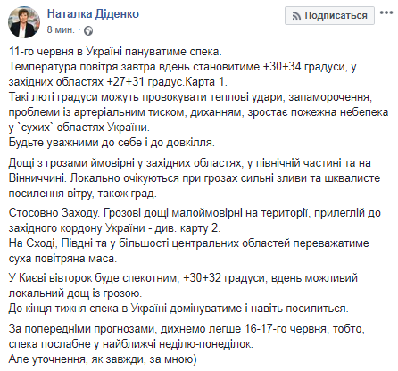 "К концу недели жара в Украине будет доминировать и даже усилится. По предварительным прогнозам, вздохнуть легче можно будет 16-17 июня, то есть, жара ослабеет в ближайшие воскресенье-понедельник", - написала Наталья Диденко.