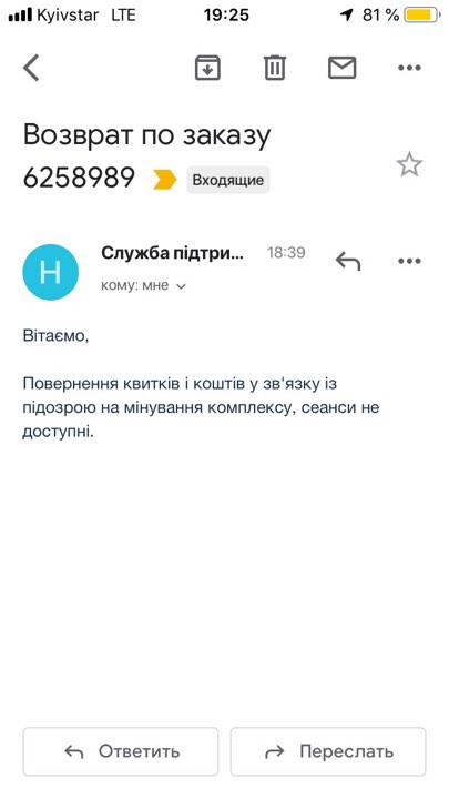 "Приветствуем, возврат билетов и средств в связи с подозрением на минирование комплекса, сеансы не доступны", - говорится в сообщении службы поддержки.