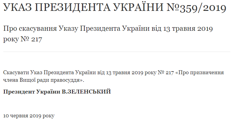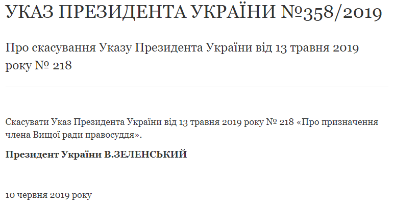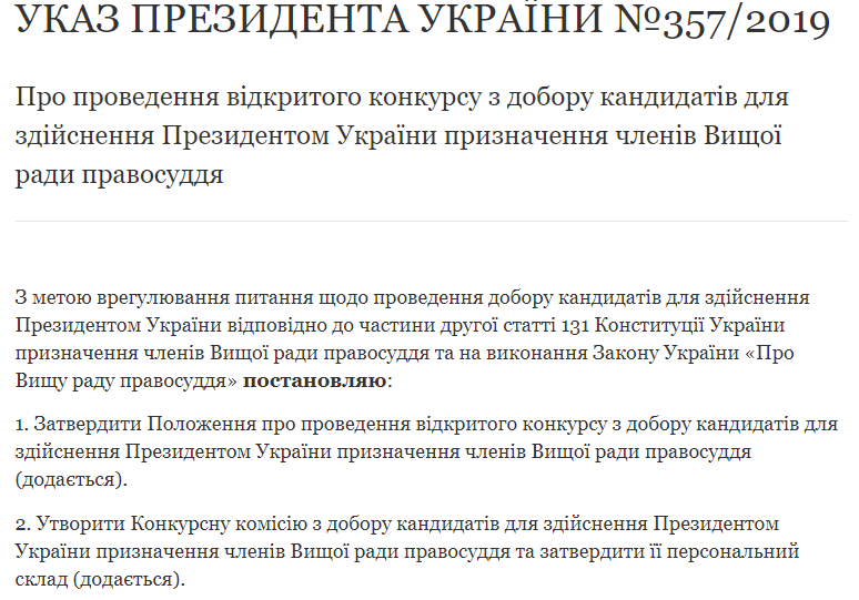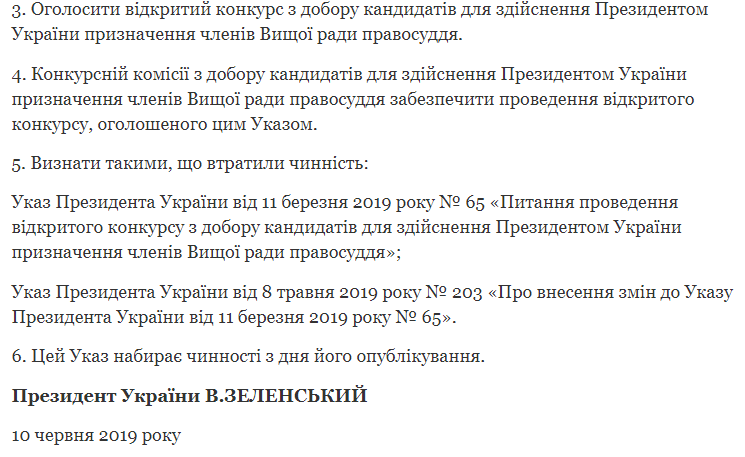 Также Зеленский издал указ №357 о проведении открытого конкурса по отбору кандидатов для назначения членов Высшего совета правосудия.