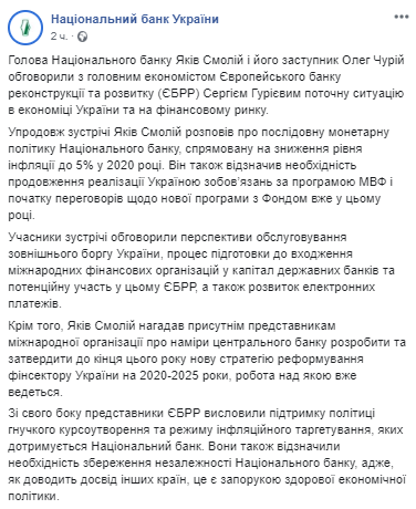 Смолий также напомнил о намерениях центрального банка разработать и утвердить до конца года новую стратегию реформирования финансового сектора Украины на 2020-2025 годы, работа над которой уже ведется. Со своей стороны представители ЕБРР выразили свою поддержку политике гибкого курсообразования и режима инфляционного таргетирования, которых придерживается Нацбанк. Они также отметили необходимость сохранения независимости НБУ, поскольку, как показывает опыт других стран, это является залогом здоровой экономической политики, отмечается в сообщении.