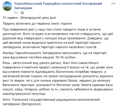 "Рысь - автохтонный вид данного региона. Факт его самостоятельного возвращения и заметный прирост численности указывает на то, что условия зоны отчуждения полностью соответствуют биологическим потребностям животных, а негативное влияние человека (своей хозяйственной деятельностью) в отношении рыси и животных, которые являются для хищника кормовой базой, сведено к минимуму. Огромная территория, разнообразие биотопного условий, богатая кормовая база (косули, зайцы, тетерева, рябчик и др.) Смогут обеспечить формирование самоподдерживающийся популяции", - говорится в сообщении.