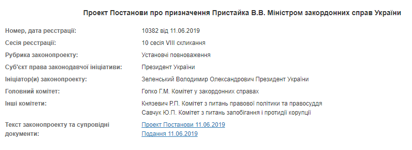 В Верховной Раде зарегистрировали проект постановления (№10382) о назначении Вадима Пристайко министром иностранных дел Украины. Соответствующее постановление во вторник внес президент Украины Владимир Зеленский, говорится на сайте парламента.