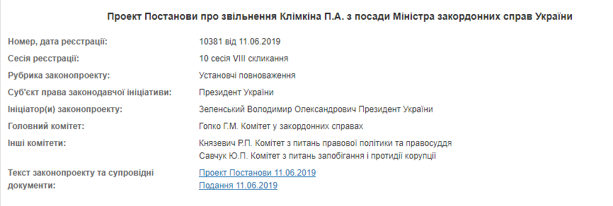 Также в Раду поступил повторно инициированный Зеленским проект постановления об увольнении Павла Климкина с должности главы МИД Украины.
