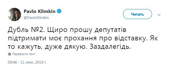 "Дубль №2. Искренне прошу депутатов поддержать мою просьбу об отставке. как говорят, очень благодарен. Заранее", - написал он.