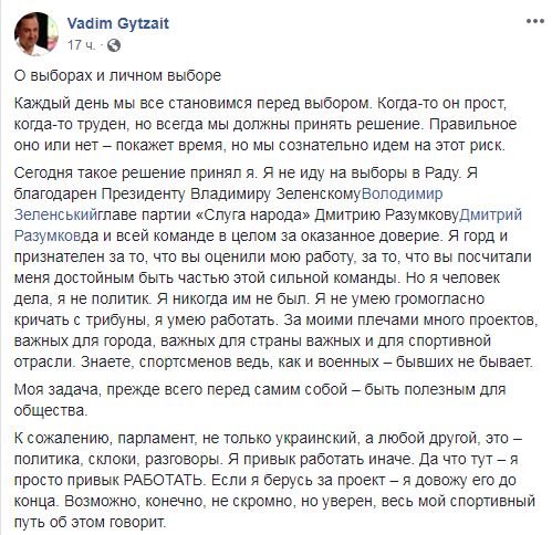 "Я не иду на выборы в Раду. Я благодарен президенту Владимиру Зеленскому, главе партии "Слуга народа" Дмитрию Разумкову и всей команде в целом за оказанное доверие. Я горд и признателен за то, что вы оценили мою работу, за то, что вы посчитали меня достойным быть частью этой сильной команды. Но я человек дела, я не политик. Я никогда им не был. Я не умею громогласно кричать с трибуны, я умею работать. За моими плечами много проектов, важных для города, важных для страны важных и для спортивной отрасли. Знаете, спортсменов ведь, как и военных – бывших не бывает", - написал Гутцайт в Facebook.