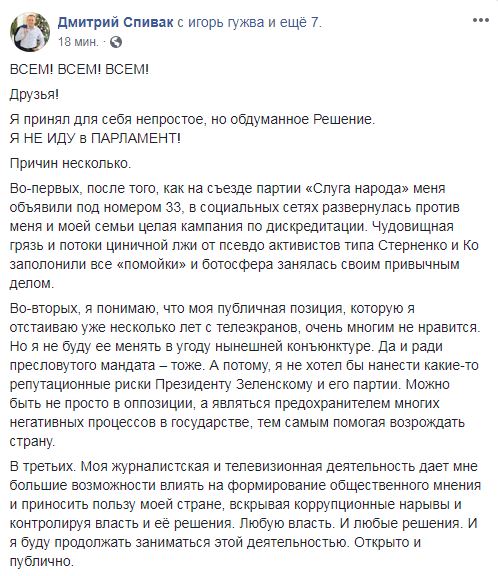 Бывший депутат Одесского горсовета, блогер и ведущий на телеканале NewsОne Дмитрий Спивак написал в Facebook, что не идет в парламент по списку партии президента "Слуга народа", в котором он присутствовал под номером 33.
