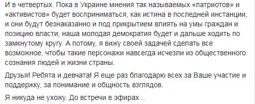 Кроме того, Спивак считает, что "пока в Украине мнения так называемых "патриотов" и "активистов" будет восприниматься, как истина в последней инстанции, и они будут безнаказанно и под прикрытием влиять на умы граждан и позицию власти, наша молодая демократия будет и дальше ходить по замкнутому кругу". "А потому, я вижу своей задачей сделать все возможное, чтобы такие персонажи навсегда исчезли из общественного сознания людей и жизни страны", - подчеркнул Спивак.