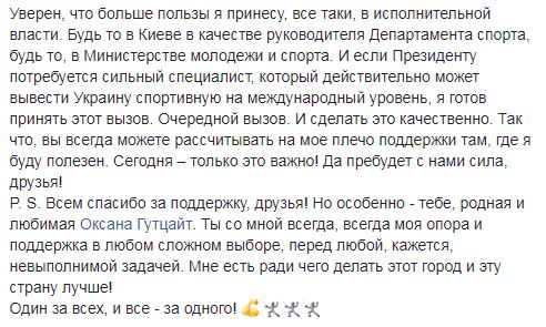 Он уверен, что больше пользы принесет в исполнительной власти: "Будь то в Киеве в качестве руководителя Департамента спорта, будь то в Министерстве молодежи и спорта. И если президенту потребуется сильный специалист, который действительно может вывести Украину спортивную на международный уровень, я готов принять этот вызов".