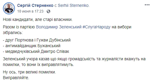 Ранее он писал: "Новые кандидаты, но старые владельцы. Вместе с партией Владимир Зеленский # СлугаНароду на выборы собрались: