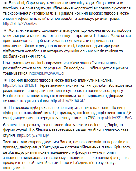 По словам Супрун, есть зависимость размера ступни, массы тела, частоты ношения каблуков и формы ступни: чем больше нагрузки на нее, тем более плоской становится ступня. Кроме того, высокие каблуки увеличивают риски появления вальгусной деформации стопы - когда кость большого пальца стопы выходит из сустава, а пальцы соединяются.