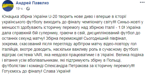 "Юношеская сборная Украины U-20 создает новое чудо и впервые в истории украинского футбола выходит в финал чемпионата мира!!! Сине-желтые в меньшинстве достигают исторической победы над сборной Италии - 1:0! Украина дала настоящий бой сопернику, играя в свой, дисциплинированный футбол до последних секунд матча Сборная победителей!" - отмечается в опубликованном сообщении.