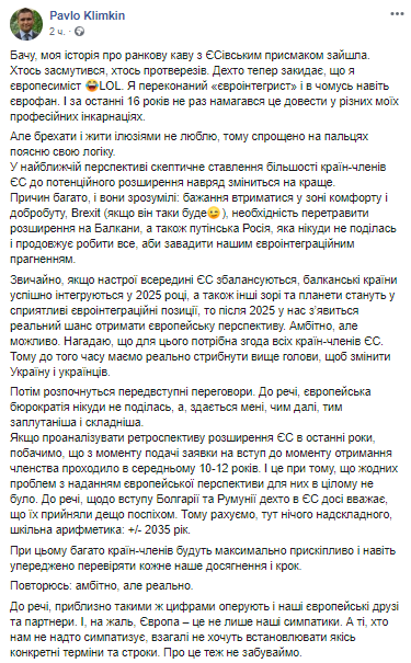 Министр иностранных дел Украины Павел Климкин считает, что страна может стать членом Евросоюза в 2035 году. Об этом он написал на своей странице в Facebook.