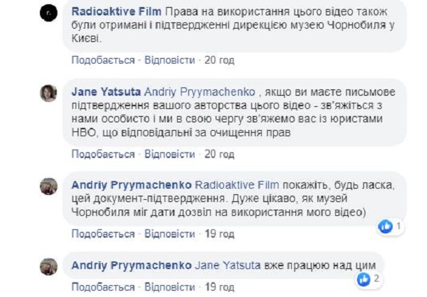 В Со Radioactive Films ответили Примаченко в Facebook: "Права на использование видео были получены и подтверждены дирекцией музея Чернобыля в Киеве". А Евгения Яцута предложила Андрею Примаченко связаться с организацией, если он предоставит письменное подтверждение своего авторства.