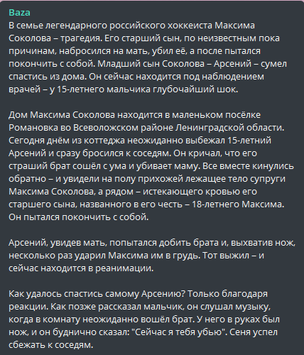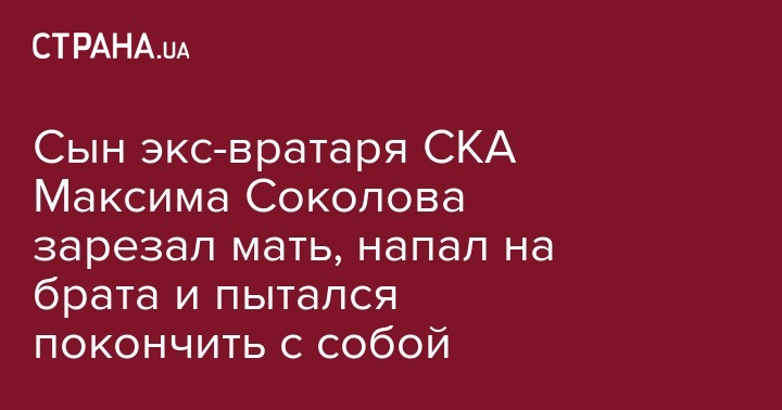 Сын экс-вратаря СКА Максима Соколова зарезал мать, напал на брата и пытался покончить с собой