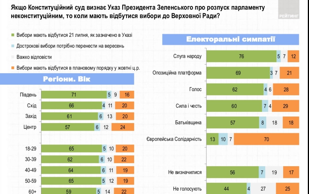 "Поддержка досрочных выборов, вера в эффективность будущего парламента и тезис о попытке народных депутатов продлить свои полномочия через обжалование решения о роспуске Верховной Рады имеют абсолютную поддержку во всех возрастных, региональных и электоральных группах, за исключением сторонников партии "Европейская солидарность", которые в своем большинстве против досрочных выборов и считают, что будущий парламент будет менее эффективным, а обжалование депутатами решения президента В.Зеленского о роспуске Верховной Рады в Конституционном суде является защитой законности", - говорится в релизе "Рейтинга".
