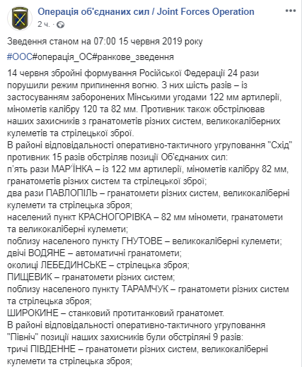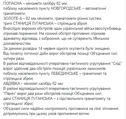 В штабе ООС сообщают, что в следствие обстрелов один украинский военнослужащий получил ранения. На каждый обстрел противник получил адекватный ответ, не противоречащей Минским договоренностям. По данным разведки, 14 июня один представитель войск противника был уничтожены.