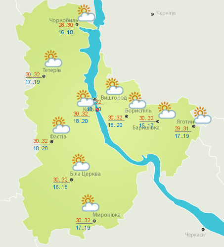 Днем температура воздуха будет держаться на уровне жарких +30…+32 градусов. А ночью в столице будет прохладнее. Столбик термометра опустится до +18…+20°C.